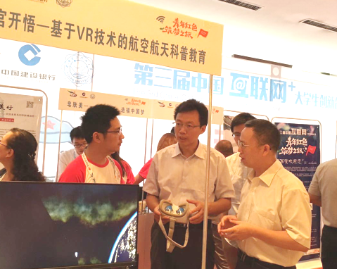 7月14日—17日,由教育部和陕西省人民政府共同主办、延安市政府和西安电子科技大学联合承办的第三届“互联网+”大赛“青年红色筑梦之旅”活动在延安成功举行。教育部高教司等单位相关领导出席了开幕仪式,近百支来自中国人民大学、南开大学、厦门大学、西安电子科技大学、南昌航空大学等高校的“互联网+”大赛参赛项目团队及“互联网+”行业青年创新创业领军人才齐聚革命圣地延安共同参加了活动。由我校王庆老师指导、软件学院和测光学院学生唐佳欣、熊轩、黄周洲等共同申报的“‘天宫开悟’——实景与VR相结合的青少年航空国防素质教育”项目得到各级领导、专家和投资人的广泛关注,率先签署了多项落地协议并一举获得新锐创意奖。中国教育台等媒体对我校项目进行了报道。 学校高度重视项目的遴选、优化与展示工作。党委书记郭杰忠对入选项目亲切关怀并予以多轮次的精心指导,同时还要求有关部门做好协调与保障工作,特别是积极鼓励项目团队打好学校航空国防特色这张牌,要“挖掘技术深度、突出覆盖广度、彰显情怀热度”,勇于在全国大型活动中积极展现学校良好形象。为做好项目推介工作,学校副校长何兴道亲自率队开赴延安,积极向主办方领导、专家及各界观展人士大力推荐“天宫开悟”项目,为项目落地而呐喊助威。