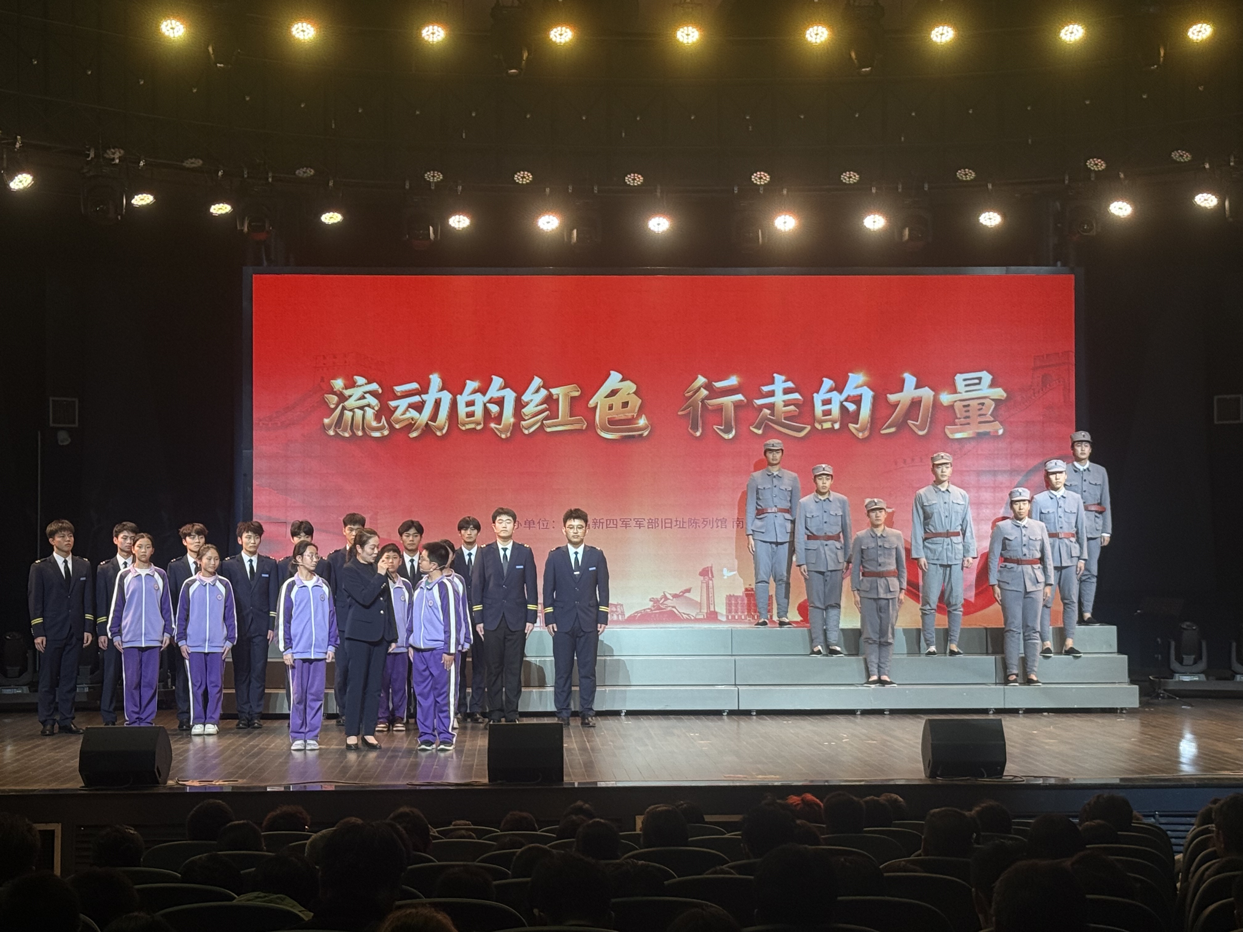 活动期间,南昌新四军军部旧址陈列馆、校团委、南昌市育新学校教育集团二七北路校区在音乐厅联合主办了一场主题宣讲,由“铁军轻骑兵”宣讲团团长、江西省新四军研究会副会长熊河水为在场师生开展题为《新四军的改编与组建》的宣讲,在宣讲过程中,展示了馆校共建设成果,由南昌新四军军部旧址陈列馆进行课程编排,我校民航学院(飞行学院)、航空服务与音乐学院同学与南昌市育新学校教育集团二七北路校区红色中队联袂演绎的情景剧大思政课《红星耀心间》《苍穹之鹰》,将历史与艺术相结合,生动再现新四军将士不屈不饶,以民族大义为重,上下一心抗战杀敌的历史,引发现场观众共鸣。